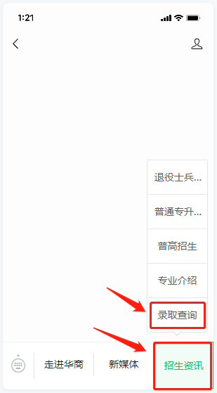 2.进入“伟德国际victor1946招生办”公众号,点击菜单栏“招生资讯”,选择“录取查询”