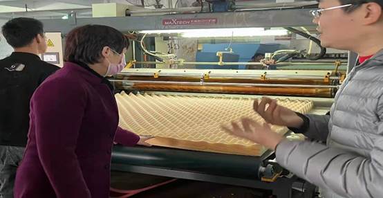 随后,在葛总的带领下,一同参观该公司床垫生产工厂。海绵床垫的生产,最关键的一步是从液体到海绵的发泡,而床垫的舒适度和支撑力主要取决于海绵的软硬度。海绵床垫由好几层的海绵组成,不同的软硬度和回弹力决定了人身体跟床垫接触之后的舒适度。