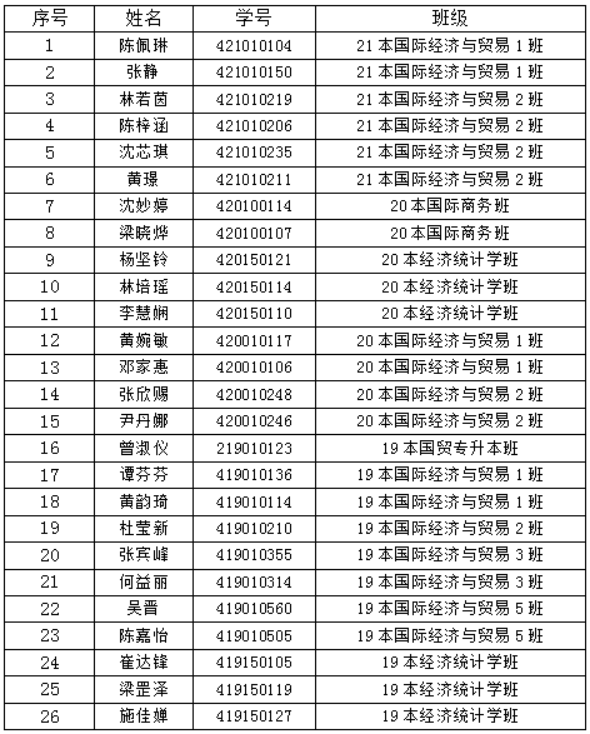 根据华商学院[2023]9号文件精神,为进一步加大学生资助力度,切实有效地帮助部分家庭经济特别困难的学生,响应新时期脱贫攻坚、精准资助的新要求。经济贸易学院积极开展2023年“学生特殊困难补助”评选活动,经辅导员在班级广泛宣传,由学生本人提出申请,班级认真评选,推荐家庭经济特别困难的学生,报学院进行评议,核查学生无违规违纪和不符合的情况后,共有26名学生获得“特殊困难补助”。现将名单公示如下: