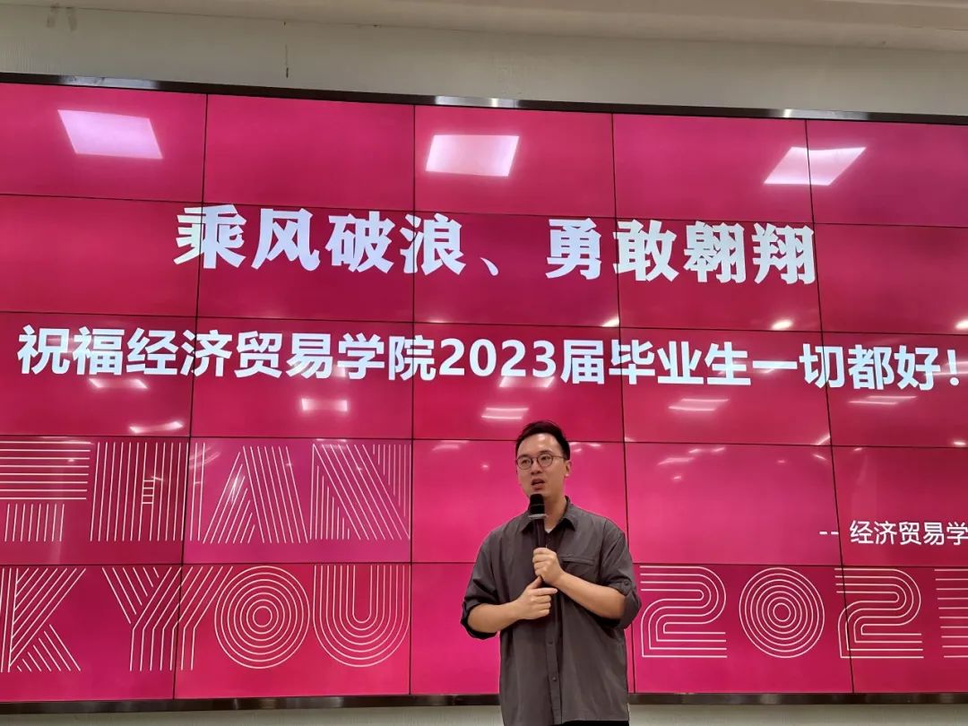 接下来,毕业生代表陈晓漳师兄代表经济贸易学院19级全体毕业生向辛勤付出的领导和老师们表示最衷心的感谢,同时也为大家分享了工作和面试的相关经验。