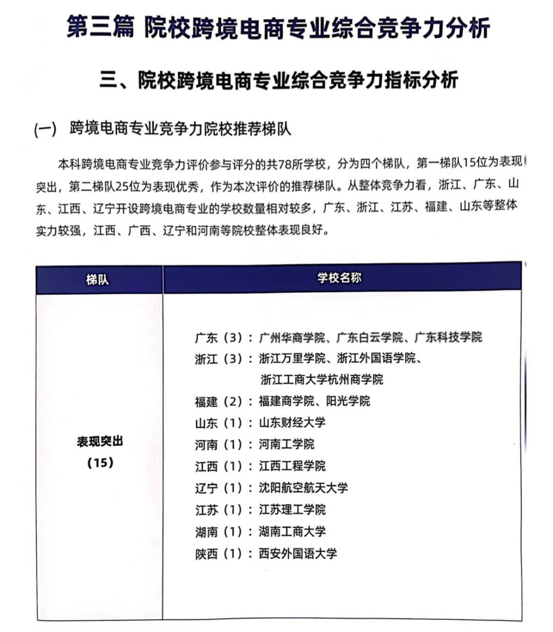 目前,全国开设跨境电子商务专业的本科高校共78所,开设该专业的高职院校有300余所,覆盖28个省市自治区。其中,广东省开设跨境电子商务专业有本科高校7所和高职院校42所。经综合评价,参与本科跨境电商专业竞争力评分的78所高校,根据评分划分为四个梯队,第一梯队15所高校为表现突出,第二梯队25所高校为表现优秀,作为本次评价的推荐梯队。广东省跨境电子商务专业表现突出的本科院校共3所,伟德国际victor1946经济贸易学院的跨境电子商务专业荣登榜单,因专业竞争力表现突出,进入第一梯队!