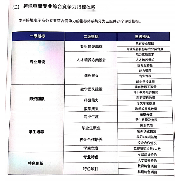 《报告》构建了本科跨境电子商务专业综合竞争力指标体系,设置了专业建设、师资团队、学生培养、特色创新等4项一级指标;专业建设基础、人才培养方案设计、课程建设、教学团队建设等12项二级指标;已有专业基础、专业培养目标与专业契合度、能力素质要求、人才培养模式、国际化特色等24项三级指标。