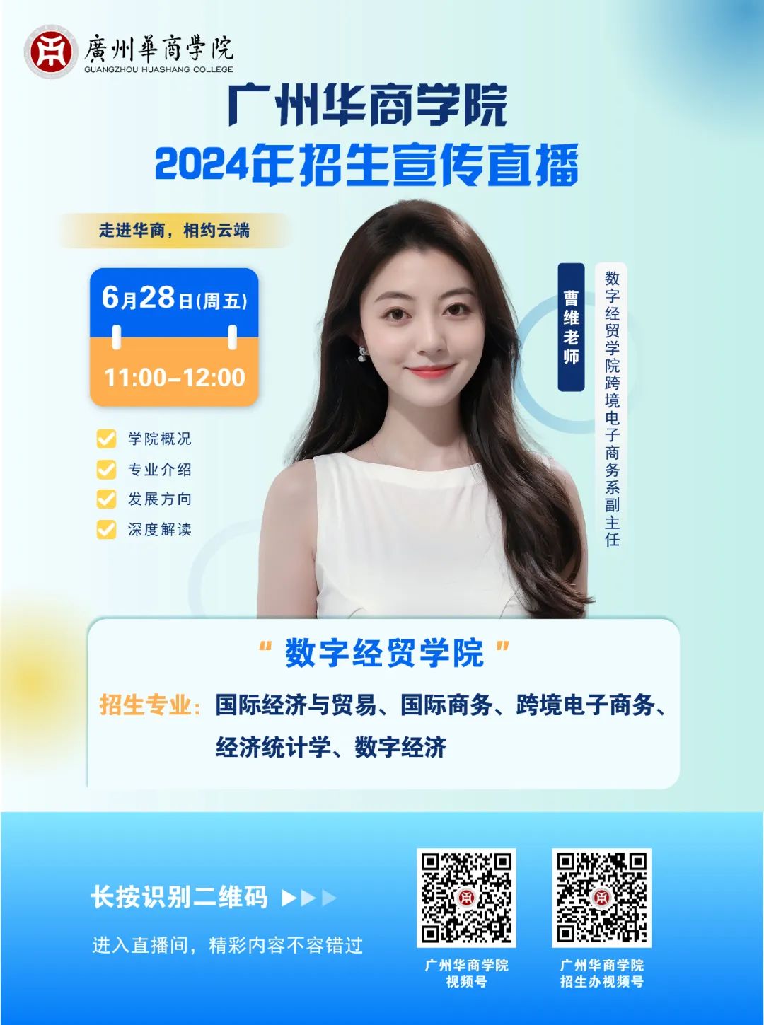 6月28日11:00-12:00、17:00-18:00 伟德国际victor1946-数字经贸学院“筑梦华商,名师教授带你探学院”云端招生宣传直播来了! 数字经贸学院曹维老师 将带你全方位了解学院招生资讯为你提供志愿填报“导航” 锁定直播间 提前预约观看 直播平台: 视频号“伟德国际victor1946” 视频号“伟德国际victor1946招生办”