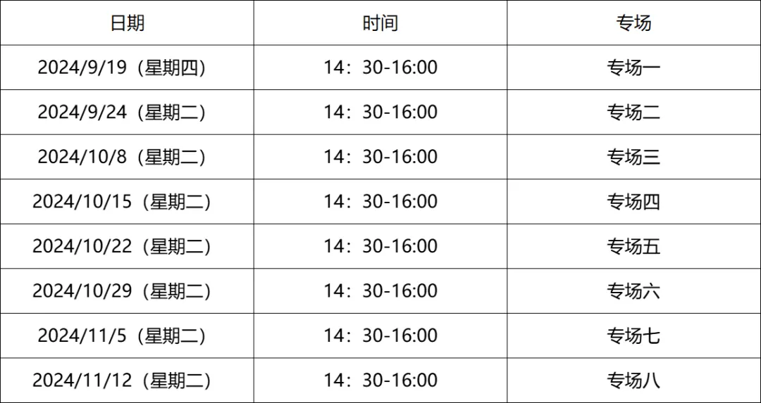 本次宣讲会设置了8个专场,具体场次设置时间见下图,欢迎用人单位根据各自的招聘时间自行选择。