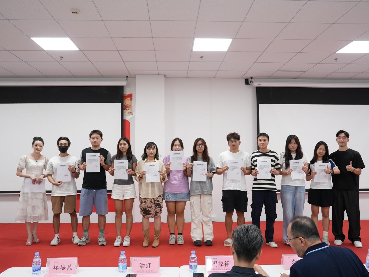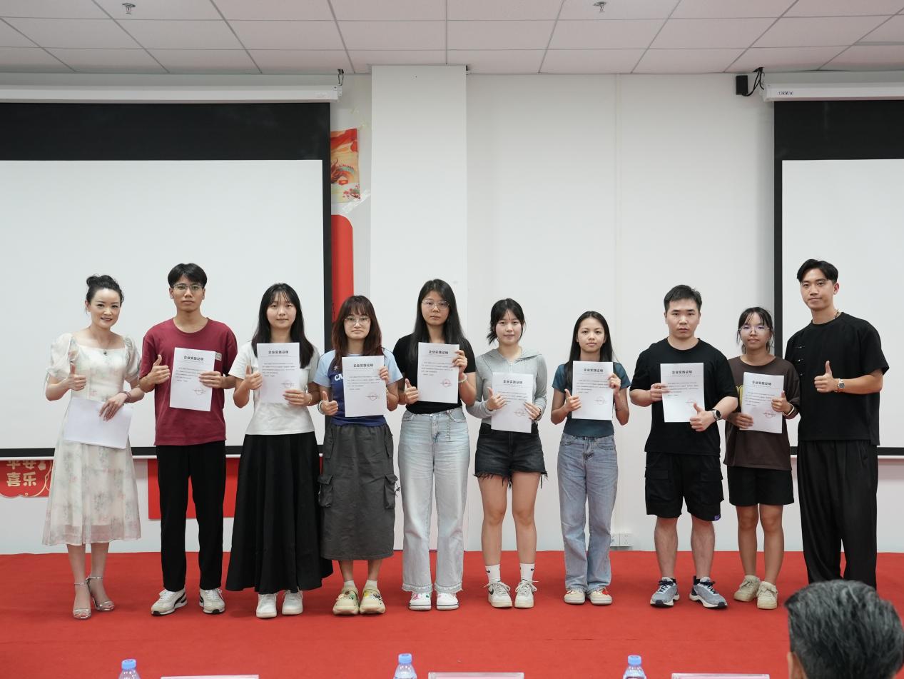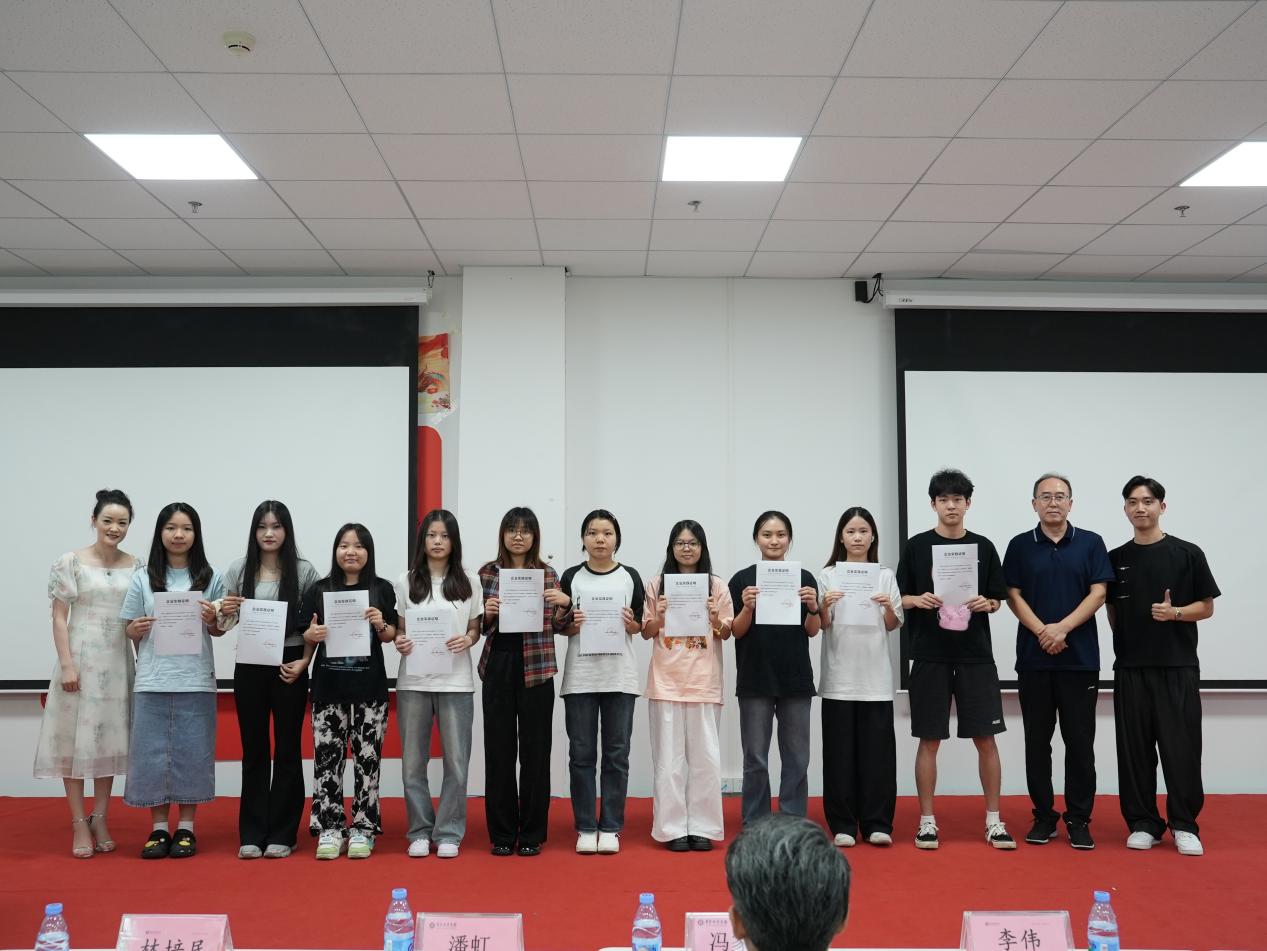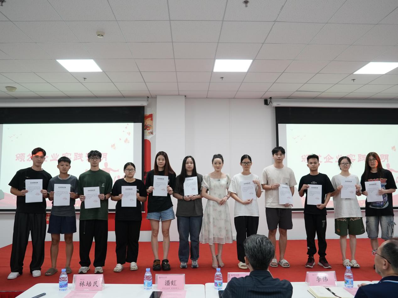随后由数字经贸学院副院长李伟教授、广州桃花岛电商咨询有限公司CEO冯家裕总经理以及校企合作办公室主任潘虹以及跨境电商工作坊运营导师林培民为学生颁发企业实践证明,以表彰他们在实训过程中的优异表现。