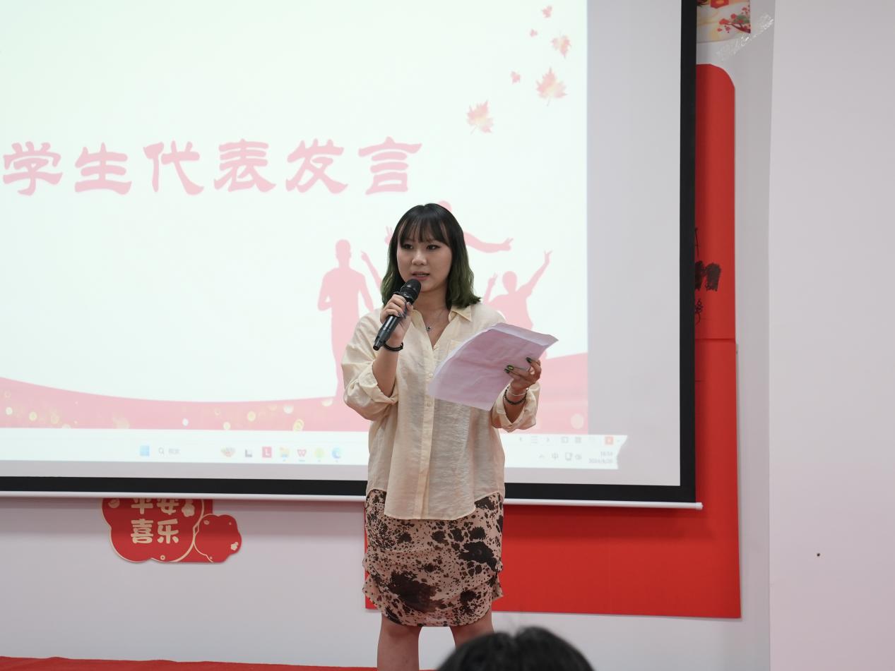 在学生代表发言环节,首先由21国商专升本2班的贝芸同学进行实训心得汇报,她说:“实训的过程是艰辛的,虽然实训中有不尽如人意的地方但收获是巨大的。我们在失败中汲取教训,在成功中总结经验。感谢这次实训,让我们更加明确了自己的职业方向和目标。我们会继续努力,不断前行。”