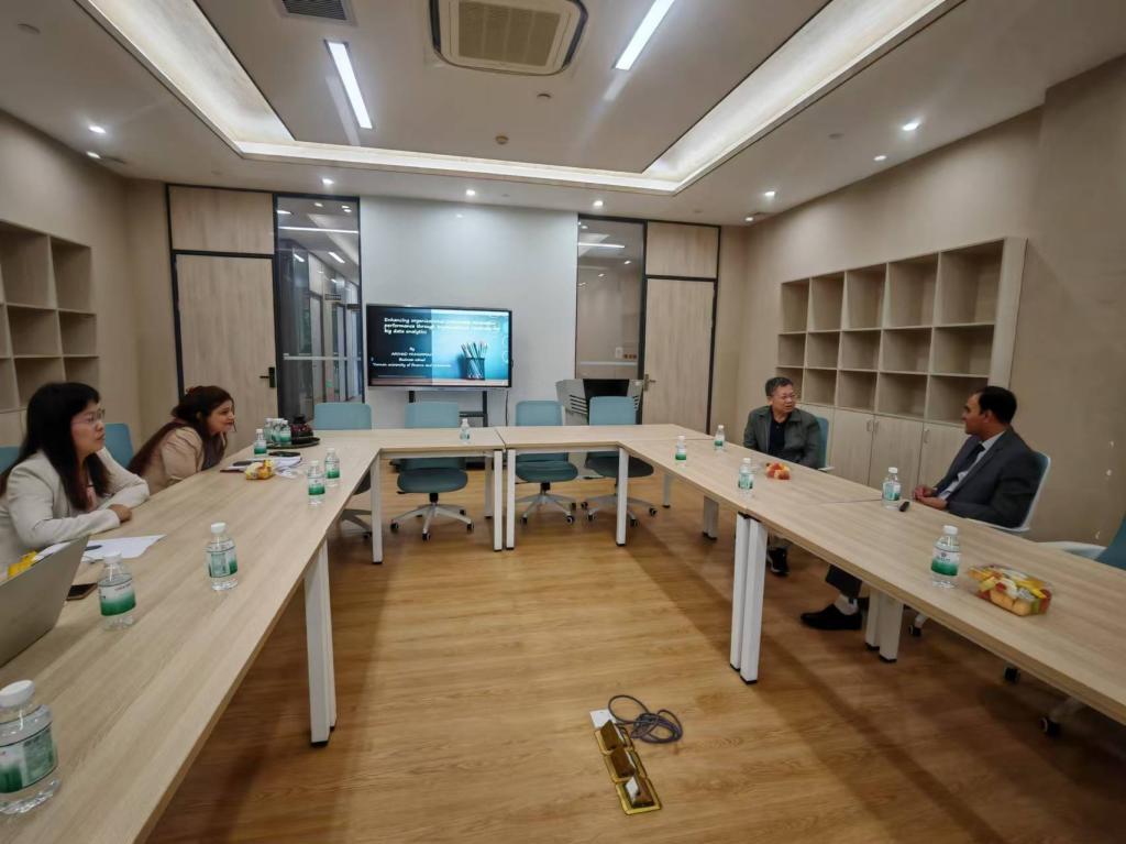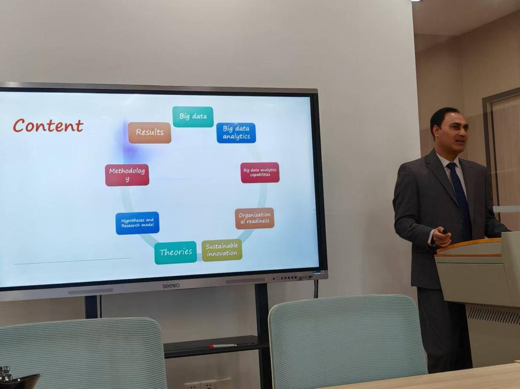 讲座分为两个部分,第一部分Arshad Muhammad博士介绍其已发表的论文。Arshad Muhammad博士以其2024年发表的论文为框架,为老师们展开了一场详尽而系统的讲解。首先,他从大数据的定义入手,逐步深入到大数据分析的涵义到大数据分析能力的培养过程。随后,Arshad Muhammad博士阐述了敏捷组织反应与持续创新两者之间的内在联系,以及它们对于组织发展的推动作用。其次,Arshad Muhammad博士介绍了大数据相关的理论背景,并在此基础上展示了他的假设与研究模型,通过生动的案例和严谨的数据分析,展现了模型的构建过程及其背后的逻辑。最后,Arshad Muhammad博士总结了讲座的核心内容,并展示了他的研究成果,验证了前文的理论假设。