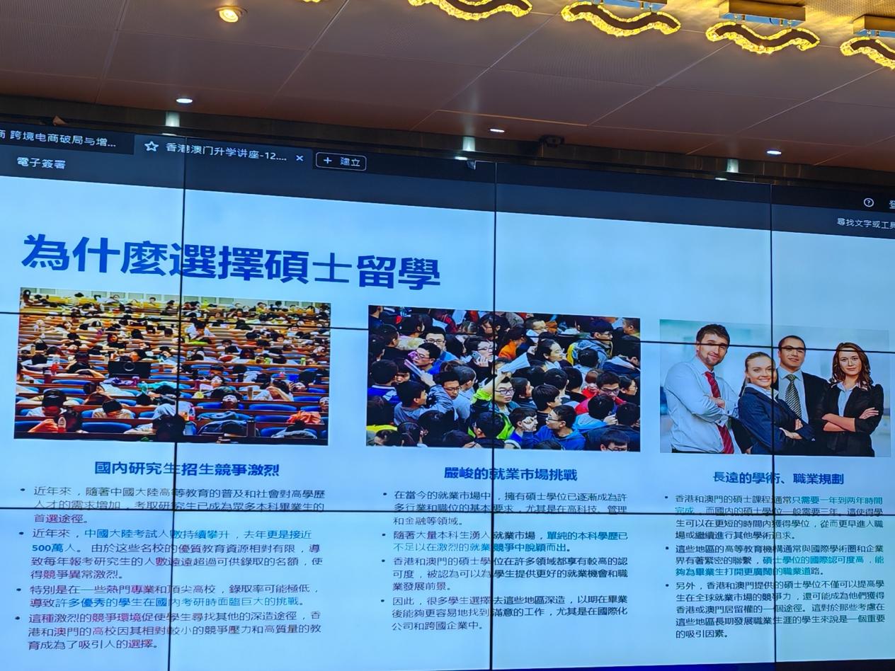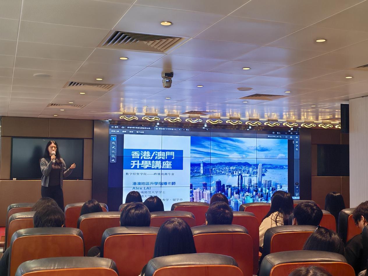 学生们还聆听了在教育和升学指导领域具有丰富经验和专业知识的赖老师(Alex Lai)主讲的港澳名校研究生升学指导课程,该课程为他们规划未来升学路径提供了极具价值的策略与建议。