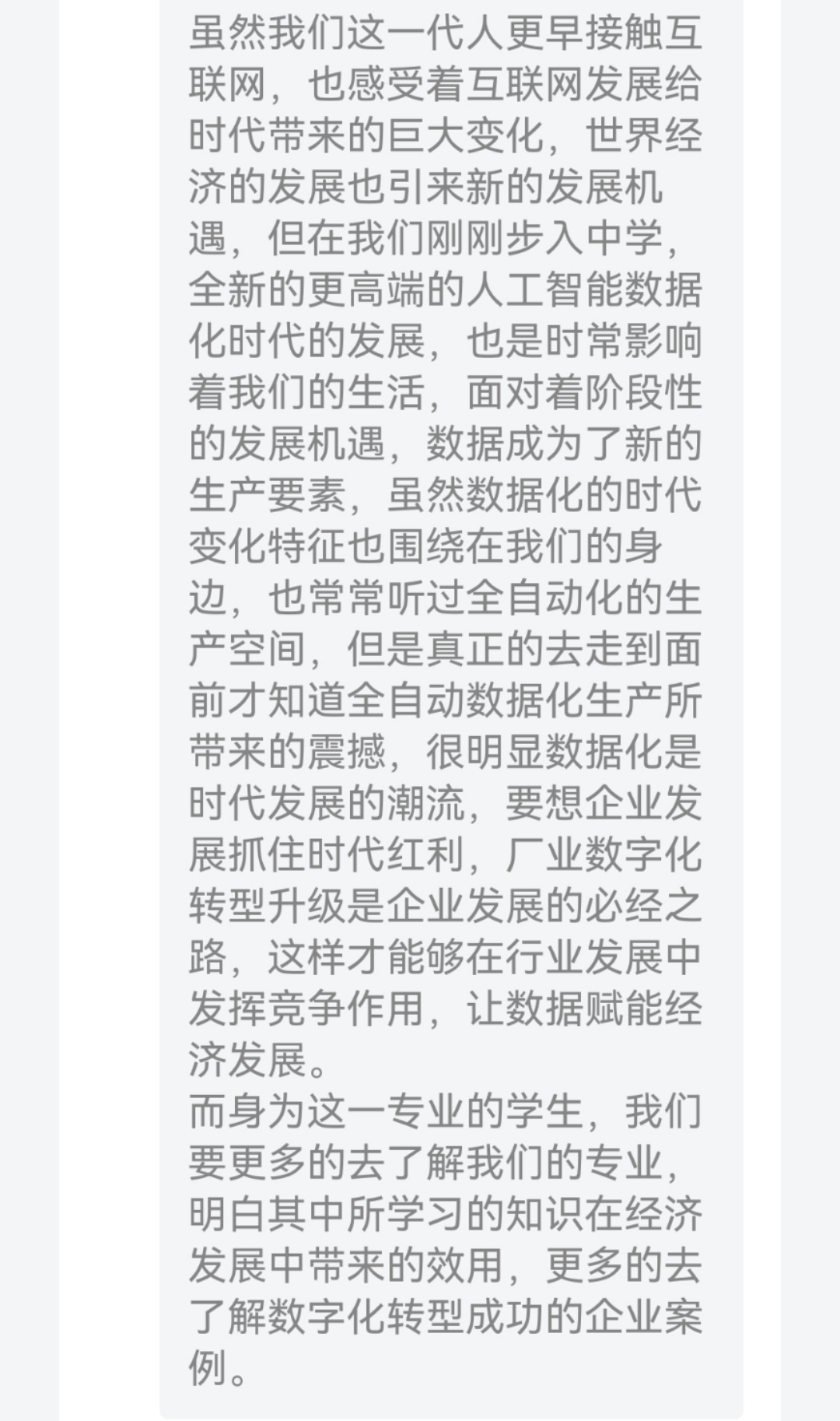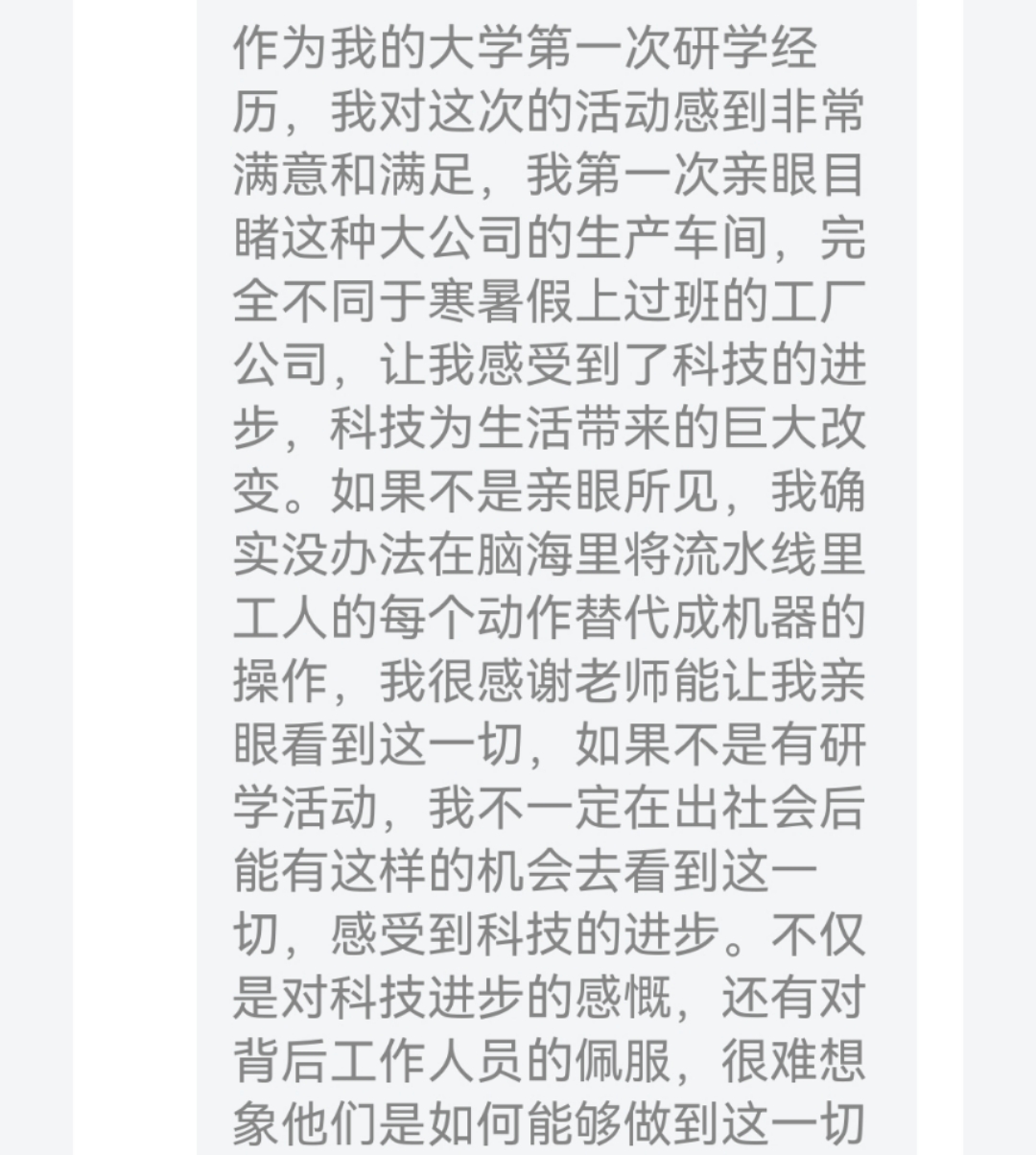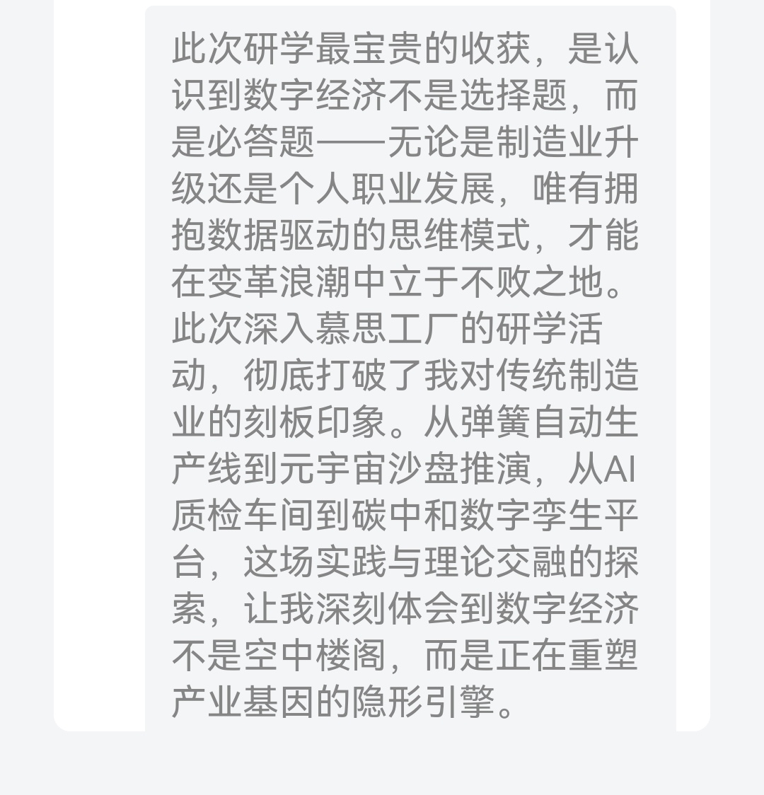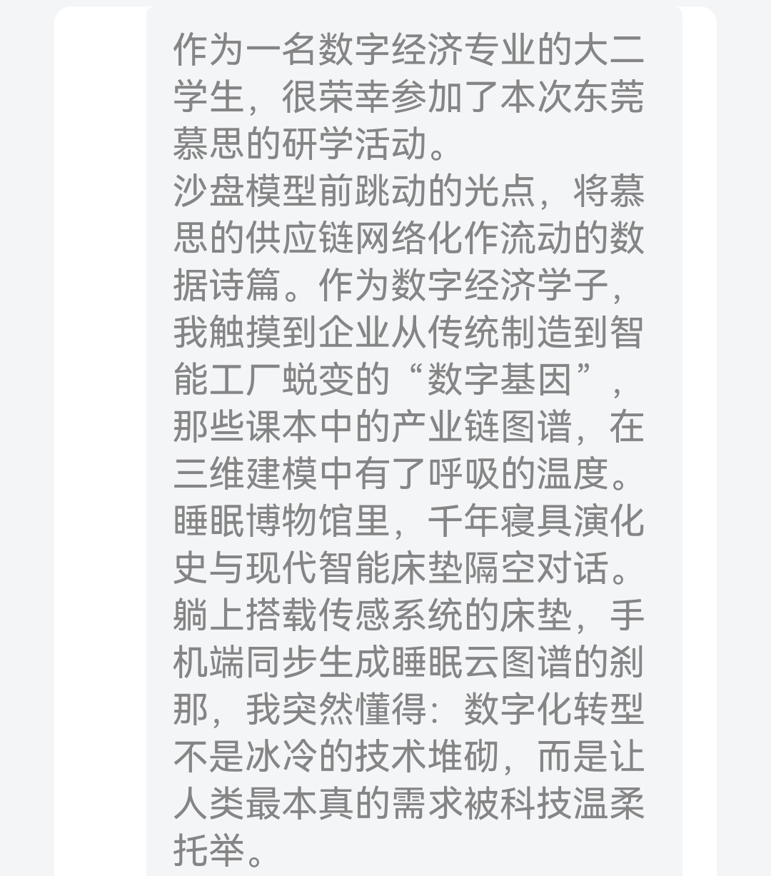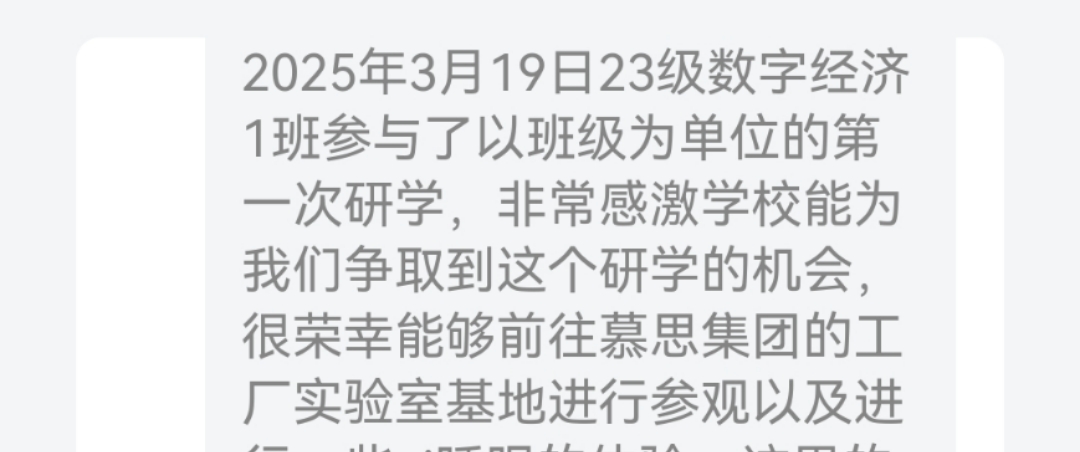 在此次研学中,慕思的"智造基因"正悄然融入学生们的思考维度——从AI压力测试系统精准捕捉用户需求的数字化触角,到工业4.0产线每日万件定制床垫的柔性化生产,每个场景都在叩击着"产业数字化转型"的课堂命题。在研学结束后,23级数字经济专业1班全体同学都记录下了自己的体会与感悟。