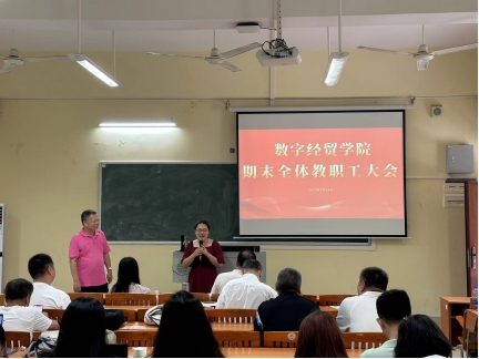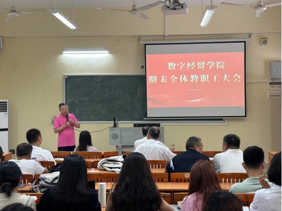 李广明院长强调,学院发展需全员参与、协同推进。他指出,学院始终以"数字经贸"为定位,坚持产教融合与数字化双轮驱动,要求全体教职员工熟知办学定位与阶段性成果。针对专任教师,李院重点提出三项要求:严把论文质量,深化课程建设与教学改革,并通报学院"十五五"规划编制及合格评估阶段性进展,要求以课堂教学质量、试卷规范管理等为抓手,夯实评估基础。