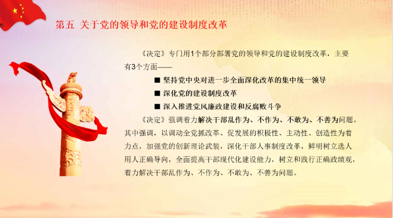 《决定》专门用1个部分部署党的领导和党的建设制度改革,主要有3个方面—— 坚持党中央对进一步全面深化改革的集中统一领导,深化党的建设制度改革,深入推进党风廉政建设和反腐败斗争
