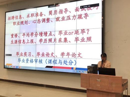 随后辅导员刘甜玲老师发表讲话,她指出,在毕业生正面临的学习及工作安排的重要环节中,学院针对学生关心的重修、学分绩点、毕业实习、毕业资格审核等问题进行了细致讲解,并着重提醒了生源信息上报等重要事项,确保学生顺利毕业。同时,通过对就业形势、就业数据的深入分析,以及对各类就业途径和服务信息的介绍,让学生们对当前就业市场有了更清晰的认识。学校与学院积极提供就业服务,举办多场专场宣讲会,邀请优质企业来校招聘。学院还充分挖掘校友资源,开展校友分享活动,通过校友的成功经验为学生提供职业发展的借鉴与启示。