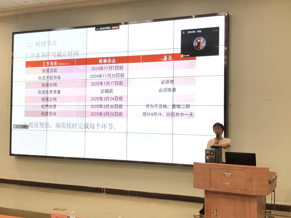 接着,梁凤银老师进行毕业论文动员,梁老师根据自身多年经验,结合具体实例,为毕业生们详细介绍了论文写作的流程与要求,解答了学生们的疑问,为毕业论文工作的顺利开展奠定了基础。 梁老师对毕业论文与设计的时间节点和具体要求进行了详细说明,并且大会中特别强调,选题应具体且有实际应用价值,开题报告要详细描述课题的主要任务、设计思路和预期成果。她强调了毕业论文的原创性和规范性,设计项目需紧密结合理论知识与实际需求。