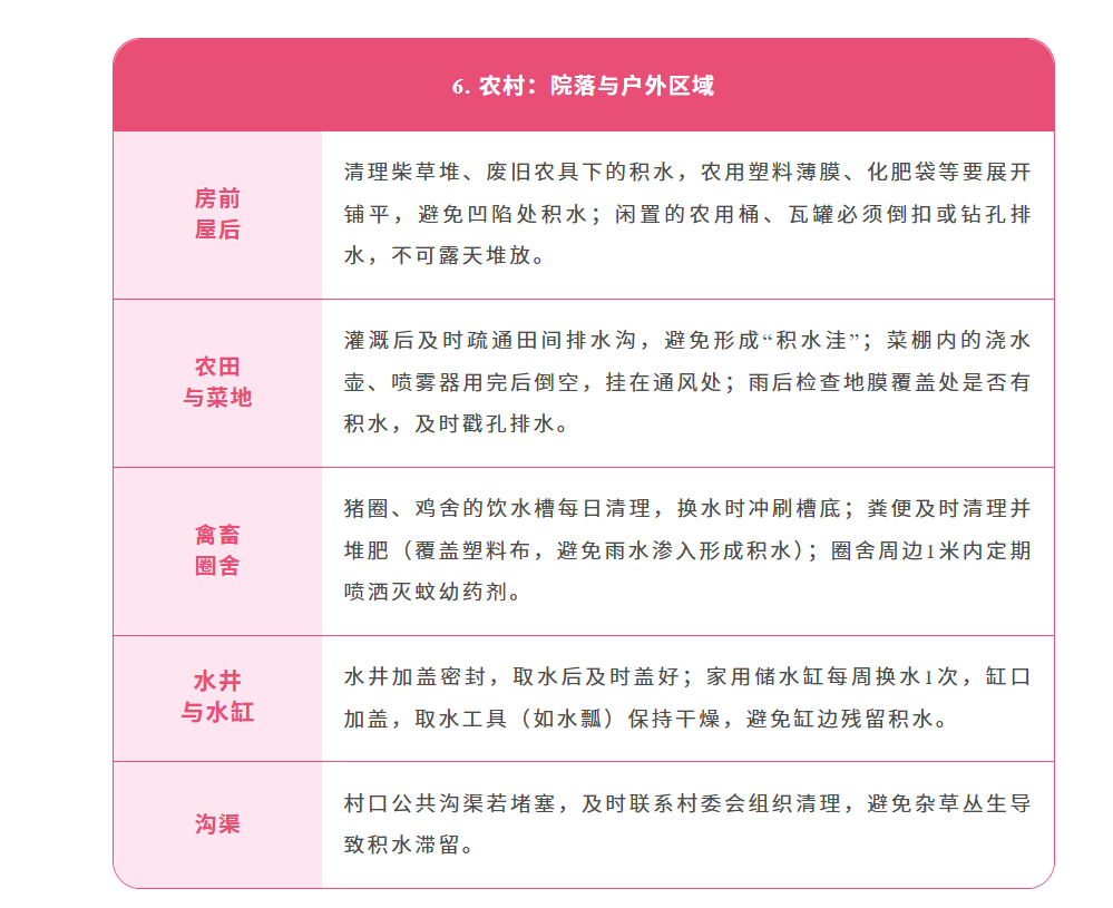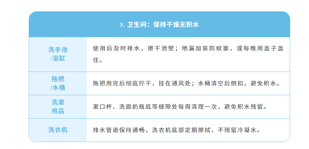 随着气温升高、降雨频繁蚊虫进入活跃期,基孔肯雅热和登革热都是经伊蚊叮咬传播的急性传染病,而伊蚊依赖积水繁殖,一旦家中存在积水等孳生地,就可能成为养育蚊子的“温床”。家庭作为蚊虫孳生和叮咬的高频场景,是防控的第一道防线,没有积水就没有蚊虫孳生,没有蚊虫就没有基孔肯雅热和登革热的传播。为了从源头切断传播链守护家人健康,这份《家庭防蚊清单》快收好并行动起来让蚊虫无处遁形!